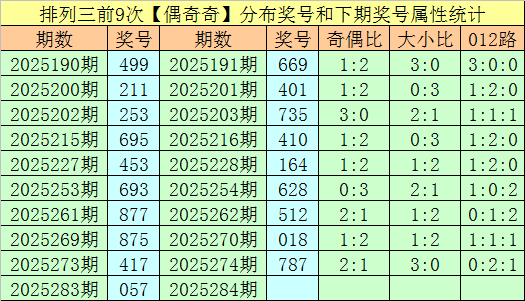 上期回顾:排列三第2025283期开出奖号057,类型为:偶奇奇、021路和小大大。