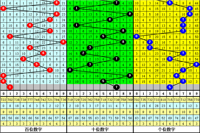 在最近9期开出奇偶分布:偶奇奇的奖号为:499-211-253-695-453-693-877-875-417,在下期出现号码分别为:669-401-735-410-164-628-512-018-787。其中百十个位号码分布情况如下:
