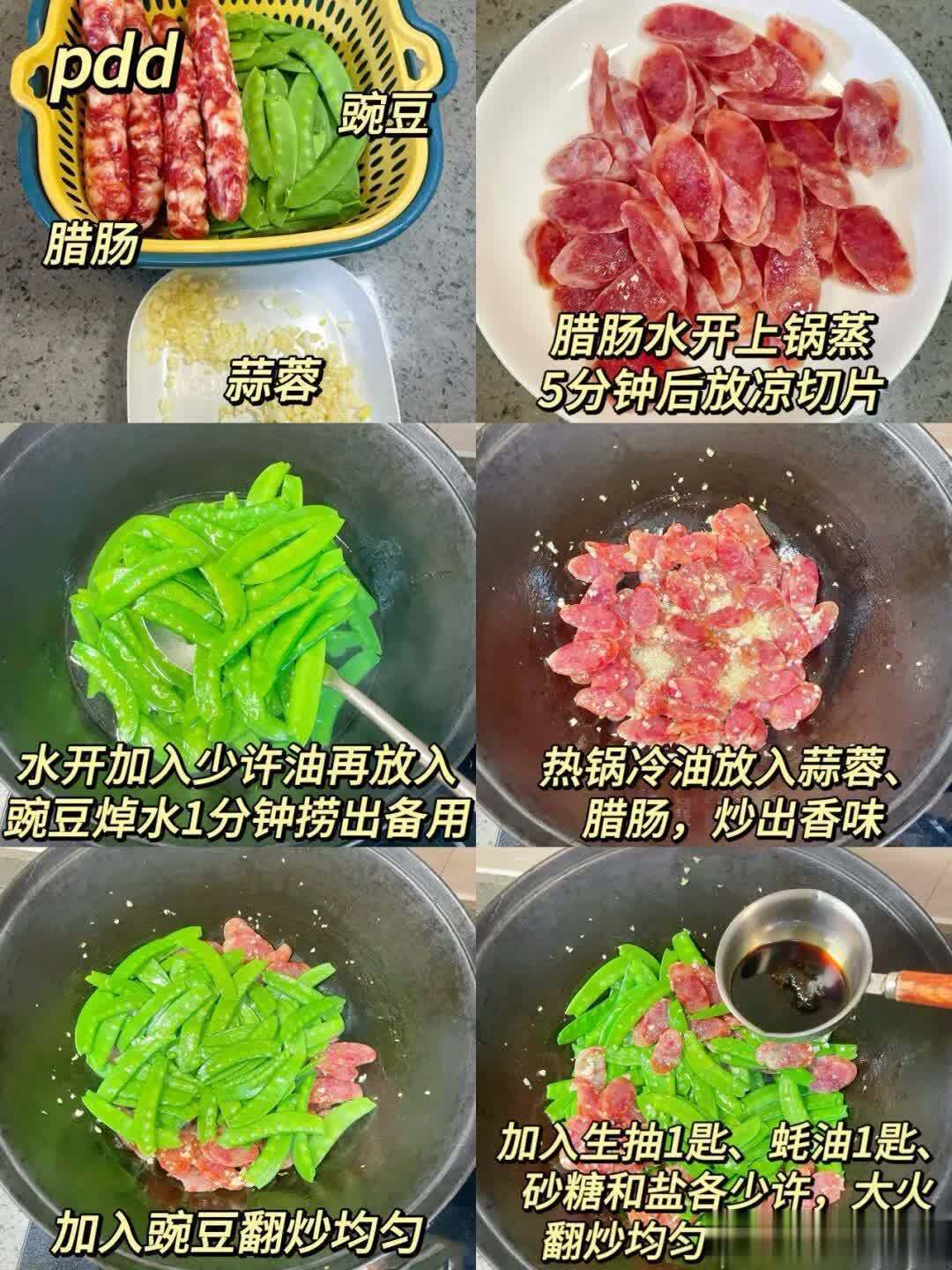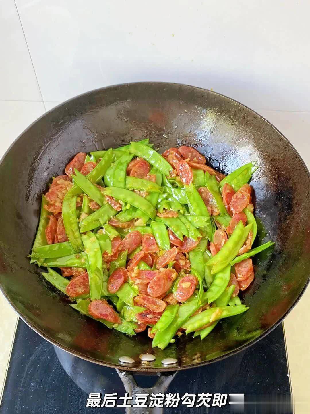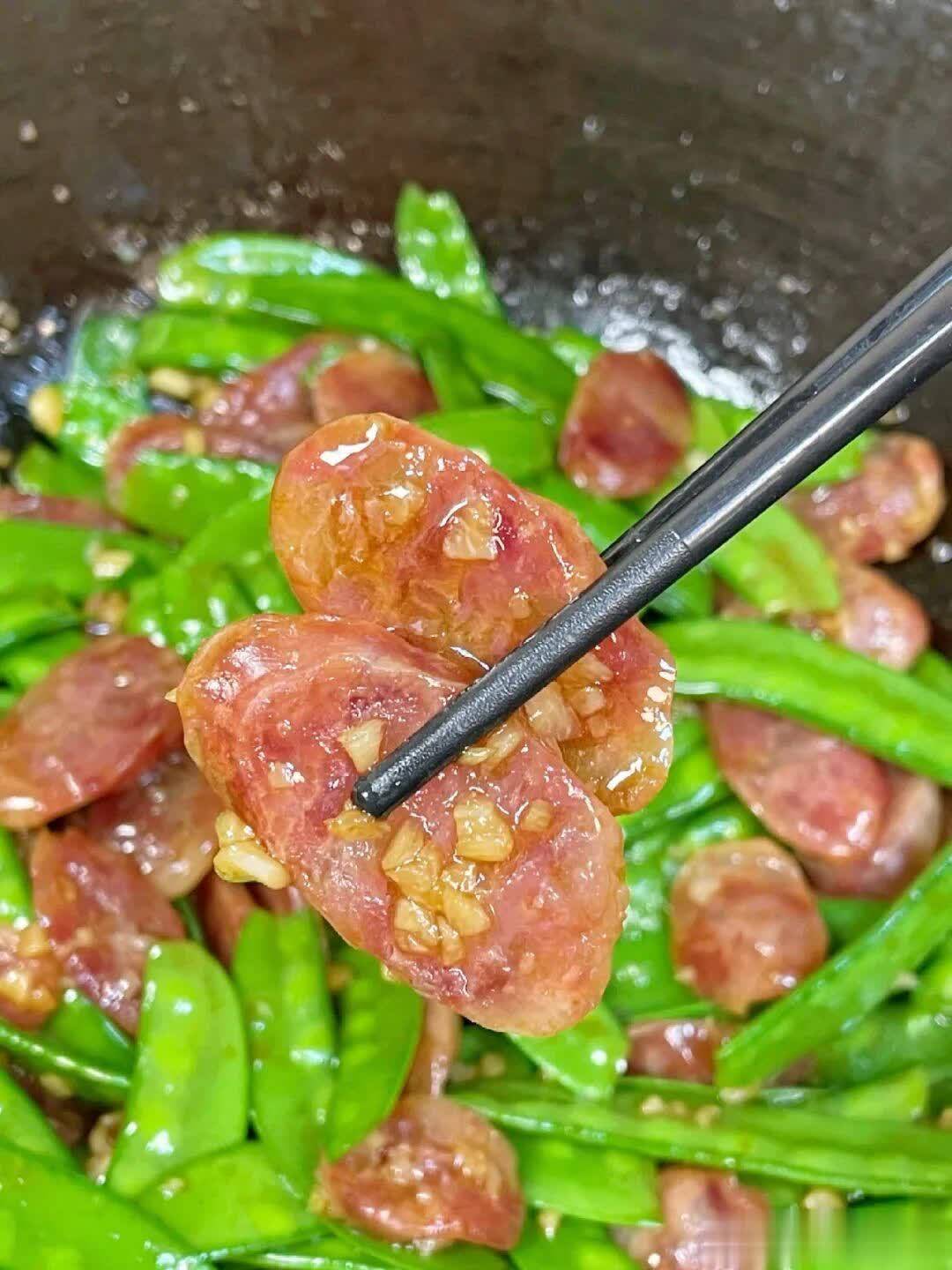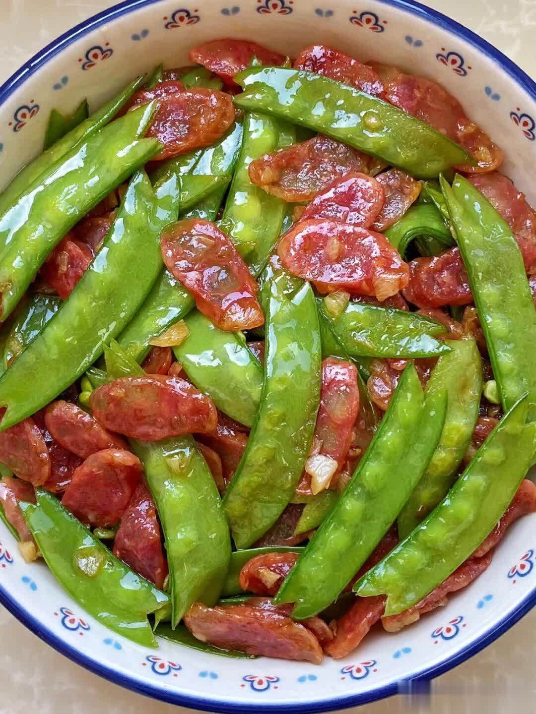 荷兰豆清爽脆嫩,富含维生素与膳食纤维,搭配香气十足的腊肠,一鲜一香,口感层次特别丰富。这道菜做法快手、颜色鲜亮,一上桌就很有食欲,既能给孩子换换口味,又能搭配主食多吃一碗饭,家常又下饭,大人孩子都爱吃。